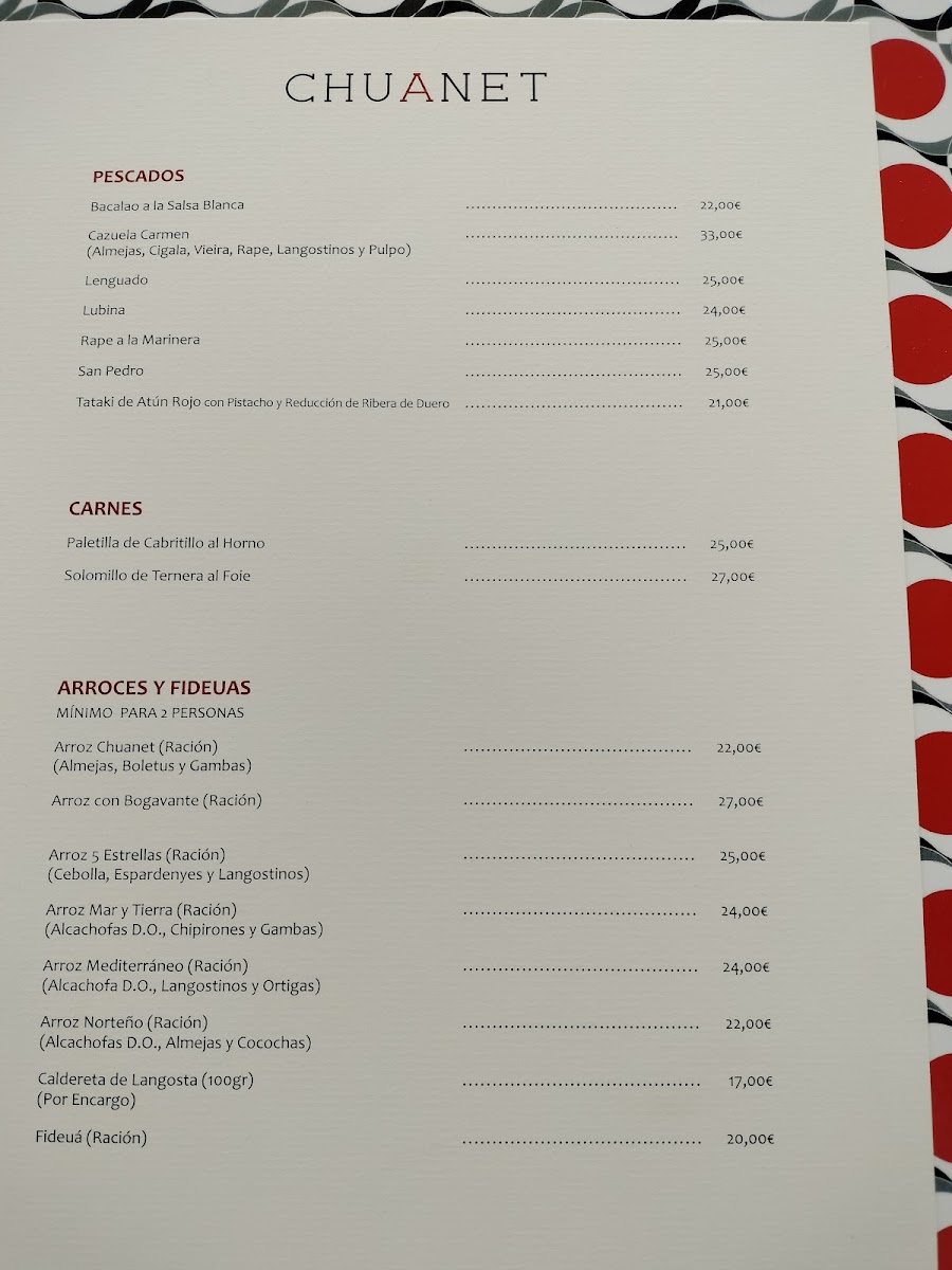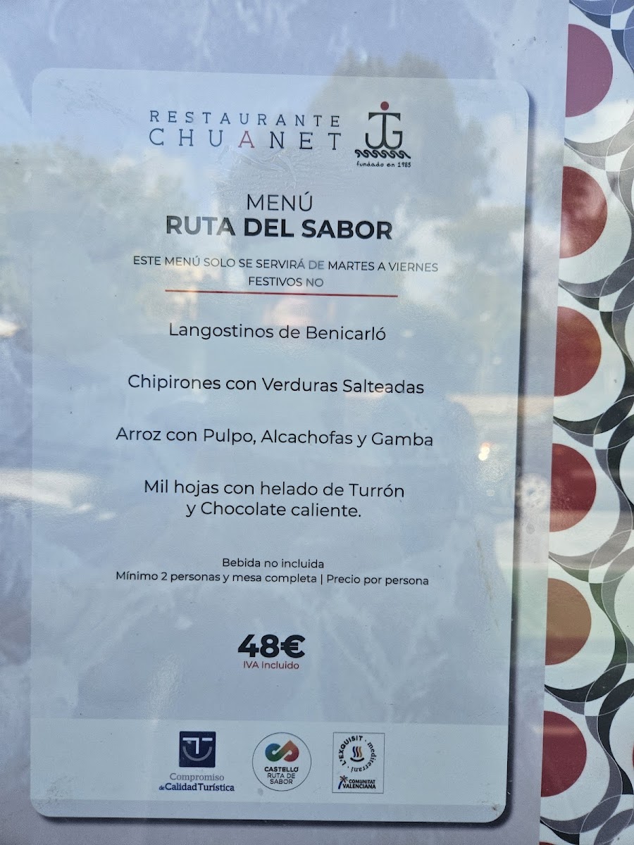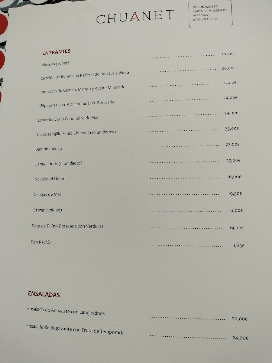 At Restaurante Chuanet Menu, located in the heart of Benicarló, you’ll find a delicious mix of traditional and contemporary flavors, perfect for anyone looking to enjoy a memorable meal. Whether you’re in the mood for something light or hearty, there’s something to suit every palate. From freshly prepared seafood dishes to savory meats and vibrant vegetable options, each plate is crafted with care and attention to detail. The menu offers a variety of regional specialties alongside innovative twists on classic favorites, all using the finest local ingredients.